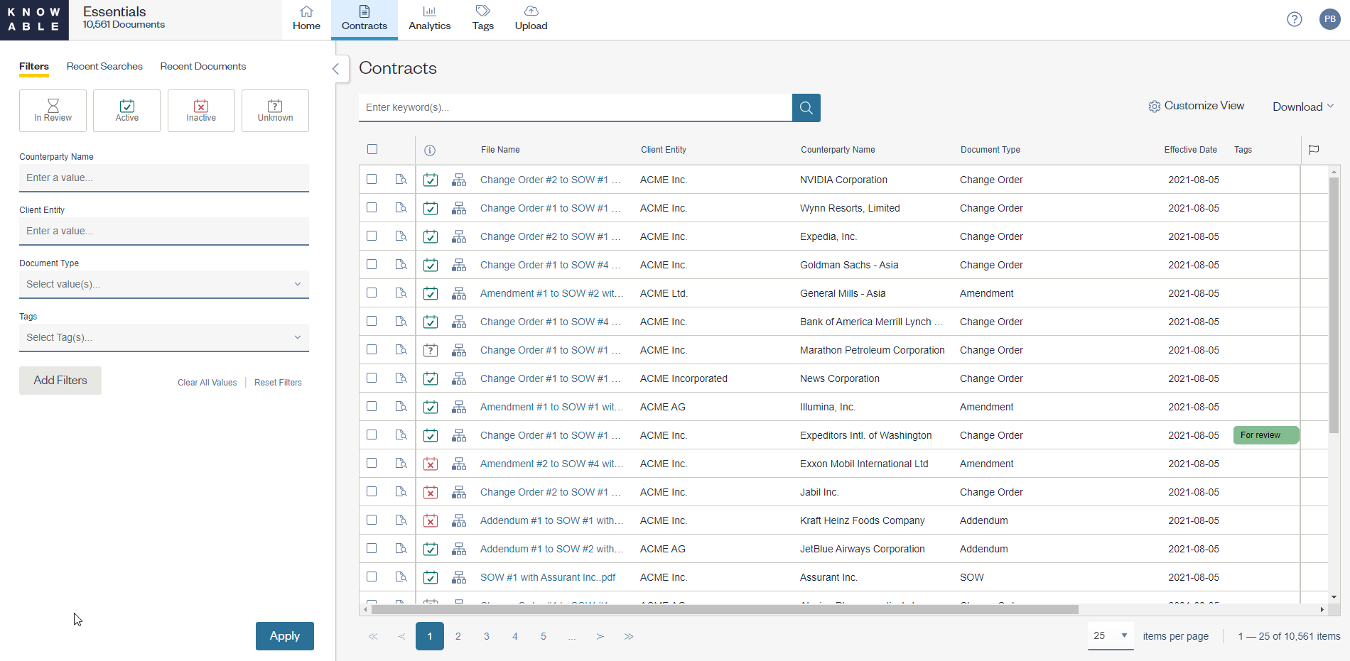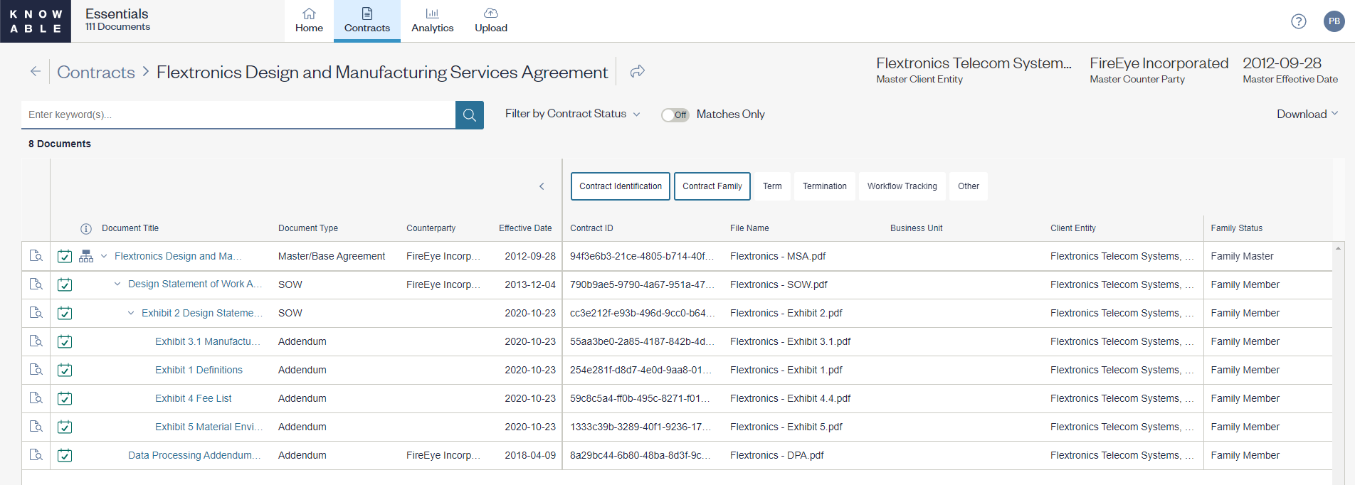 Knowable helps you find, view, and understand your contracts. Executed contracts are uploaded to the application, where Knowable’s technology and quality expertise reliably capture the critical info needed to identify your contracts and analyze your contract terms.