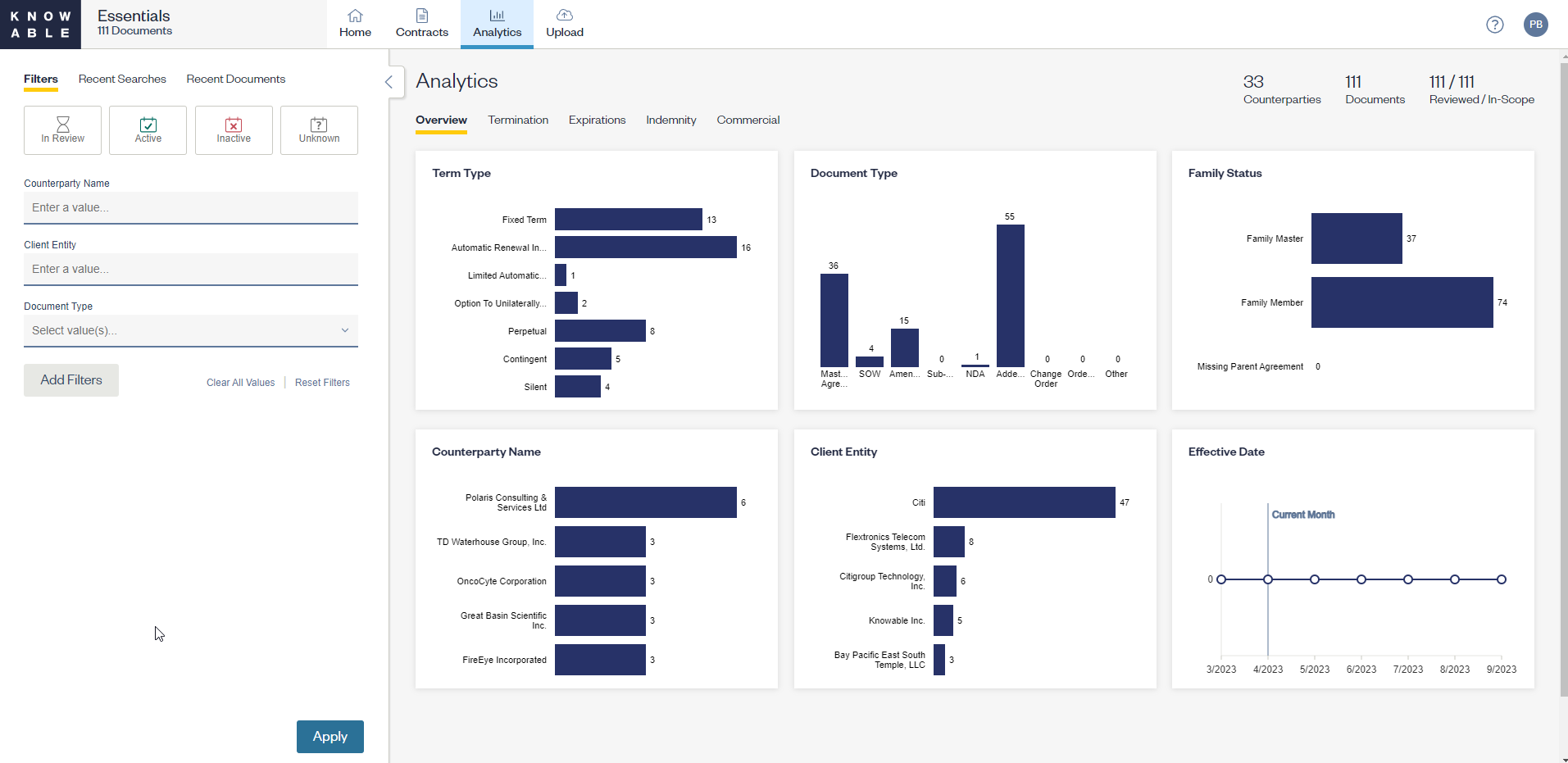 The Analytics tab provides high-level information on contracts in the Knowable platform.