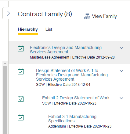 Access the family view by clicking on “View Family” in the Related Contracts pane or any of the Org Chart icons.