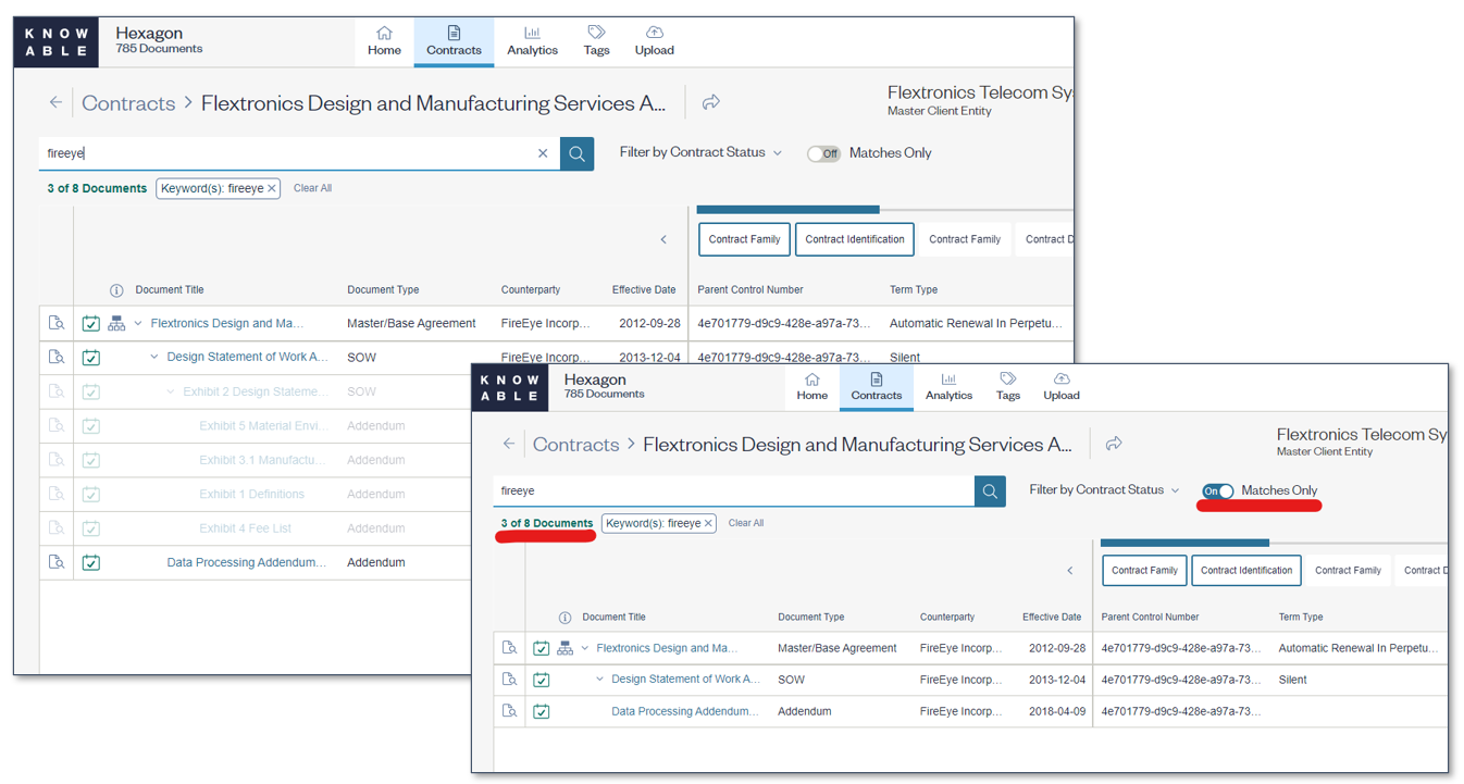 Matches Only Toggle. The Matches Only Toggle allows you to optionally search and filter on the family view and remove contracts that do not meet your search criteria. This is similar to what happens on the Contracts Page. The toggle is off by default and you will still be able to view search results in the same way with contracts that do not meet the search criteria being greyed out.